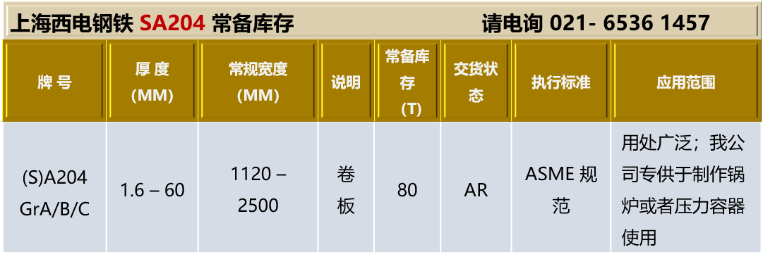 SA204GrC钢板用途:常用于石油、化工、锅炉容器等行业制造反应器、球罐、分离器、锅炉汽包等设备及结构件。